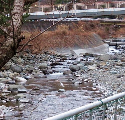 下部川の流れの中に、ダイサギが見られました。人の気配を感じるとすぐに飛んでいってしまうので、はじめは遠くからそおっと・・・。 気配をころして、そっと近づいての撮影です。流れの中に獲物をもとめるダイサギの姿でした。 ダイサギは、大きいサギといういみで、コサギ・チュウサギといったサギの仲間の中では、いちばん大きなものです。