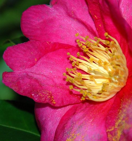 いま、金価格が急上昇。そんな頃合いに見るサザンカの花、たくさんの花粉を散らしています。思わず目がくらみそうなくらい・・・。 こちらの花は、咲き始めてまだ日数が若いもの。これからが楽しみ・・・。
