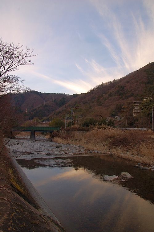 このところ注目のカワガラスたちが活躍する下部川(富士川の支流の1つ)です。ゆく川の流れは、とどまる試し無しと昔の人は言いました。また、空の形も刻々とかわっていき、川の流れにそれが写る時もあったりします。 さて、本日は水曜日。湯之奥金山博物館は、休館日となっております。どうぞご注意ください。明日の木曜からのご来館をよろしくお願い申し上げます。