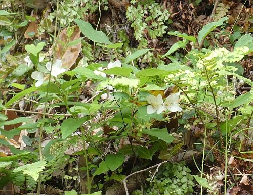 前回のシャクガを見た場所の続きで、草むらの中に白い花を見つけました。何の花だろう。 シダの仲間や、草本類に埋もれるようにして生えているのでしたが、花の特徴からバイカウツギだと考えられました。こんな小さな木でも、にぎやかに花を咲かせていて、ちょっとすごいなと思われました。