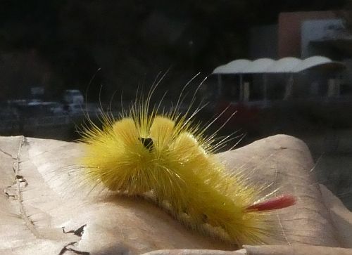先日のことですが、博物館スタッフのI部さんが、枯れ葉を一枚プレゼントしてくれました。その枯れ葉に、金色の毛虫がのっていたのです。というか、この毛虫を見せてくれたのですね。 はじめ、この写真の背景にある湯之奥金山博物館の建物前で、それを受け取ったのですが、その時点で日が陰っていたので、日差しを求めてメロディーブリッジの上に移動して写真に収めたのです。太陽の光を受け、金色に見えるリンゴドクガの幼虫でありました。 ちなみに、リンゴドクガの幼虫の、このブログへの登場は2回目で、前回はこの10月28日のことでした。