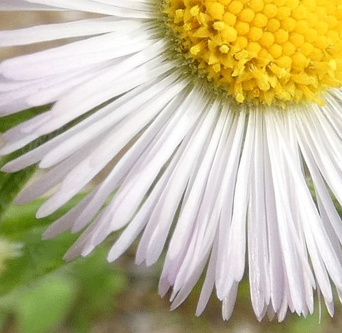 ふたたび、ハルジオンの花のクローズアップです。この写真の見どころは、まわりの白い花びら一つひとつからなる舌状花のほかに、中央部の黄色の筒状花のようすをジックリ見るところにあります。真ん中の黄色のつぶつぶは、一つひとつがつぼみです。外寄りの黄色の筒状花、星形に開いているのも注目です。 上の1つめの写真は、筒状花が開き始めたばかりの若い花ですが、こちらは、筒状花が外側から中心に向かって咲き進んだ状態で、それを横から見ています。筒状花の黄色のしべが、長く突き出ているのがわかります。