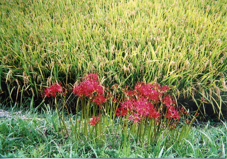 たわわに実るのは コシヒカリか かたわらにヒガンバナを添えて うまし瑞穂と救荒と天が二物を与える秋