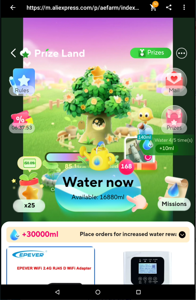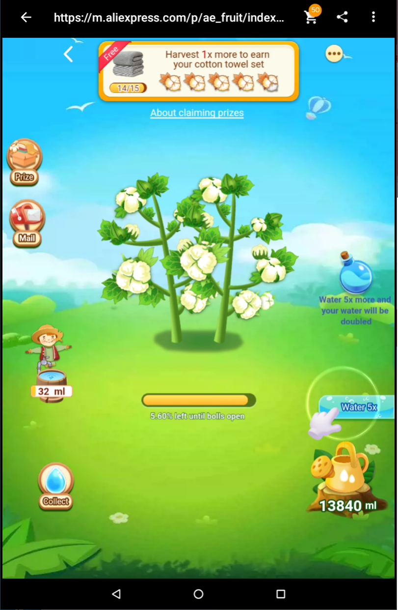 Prize Landは Missionを達成することで Waterをもらって、それを植物に与え続け、植物が実を成らせると(送料として少額支払う必要がありますが)商品がもらえるというものです。しかし進捗率を表す % のすすみかたが、ゲームの開始直後は大きく変化しますが、だんだん進まなくなっていきます。