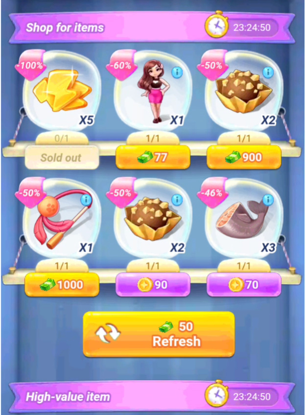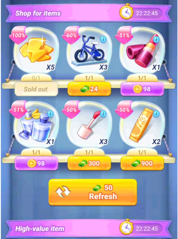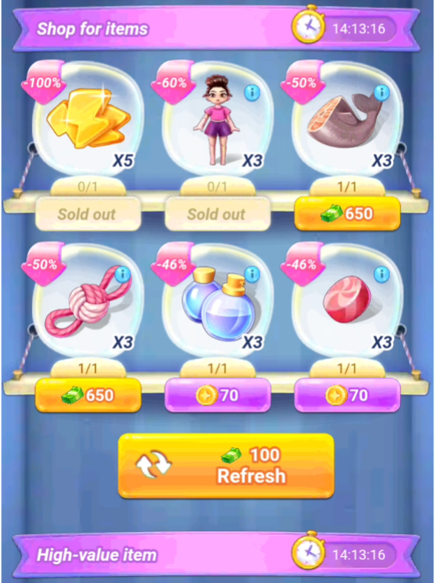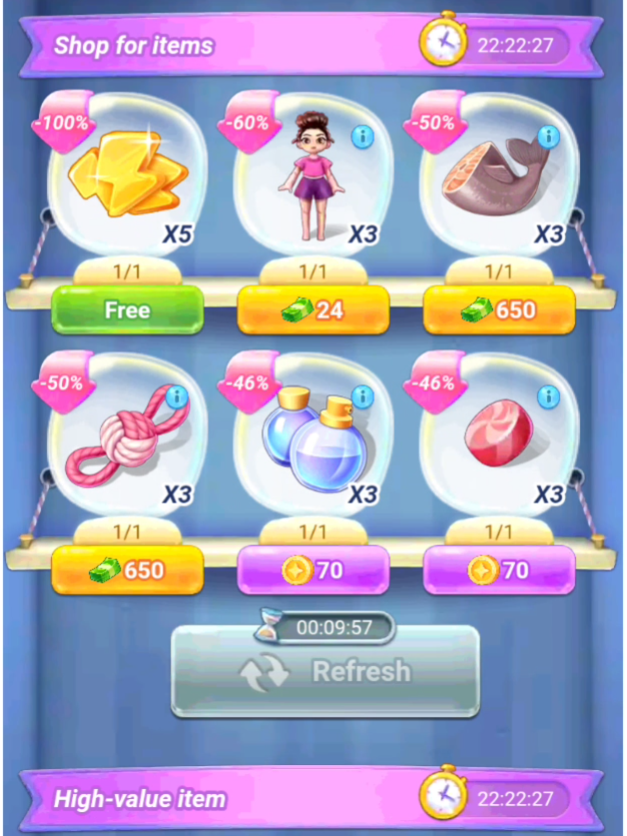 daily mission で合計900通貨もらえるので、最後の1個の商品として 550通貨以下のものを購入すれば、通貨を減らすことなく、energyx45 と商品/generatorの材料を入手することができます。(レベルが上がると Shop for items で購入できる最低金額が上がってしまいます:24→300)