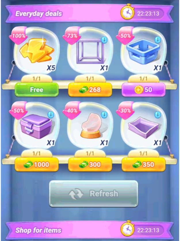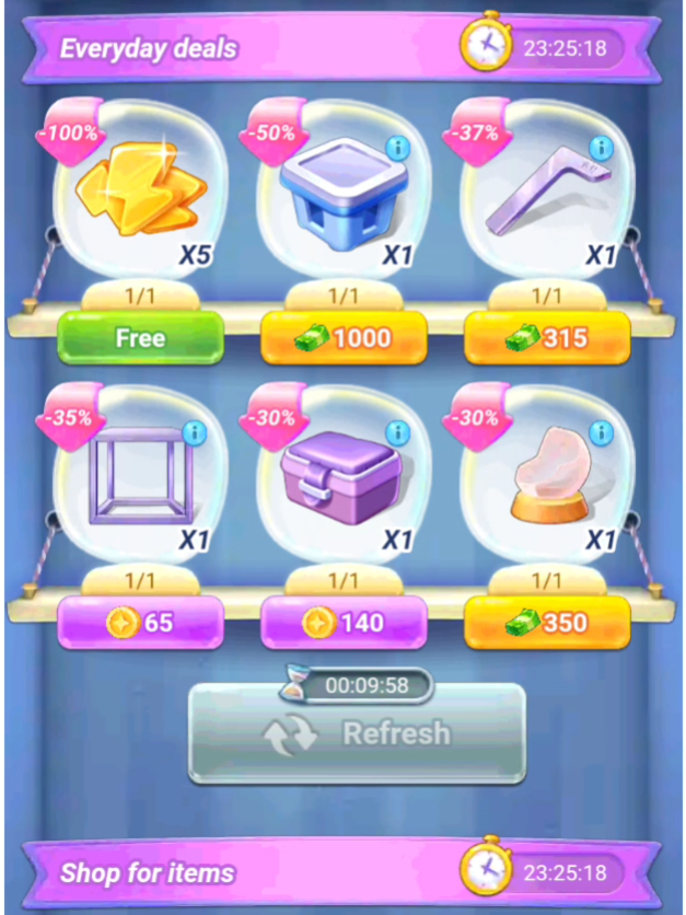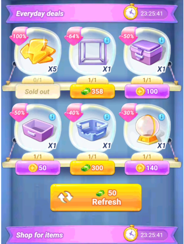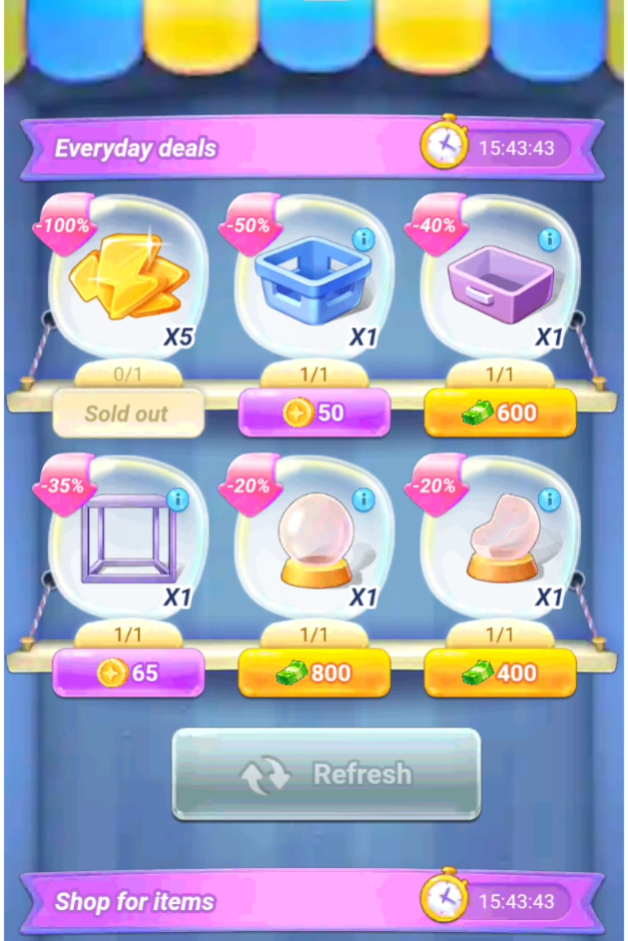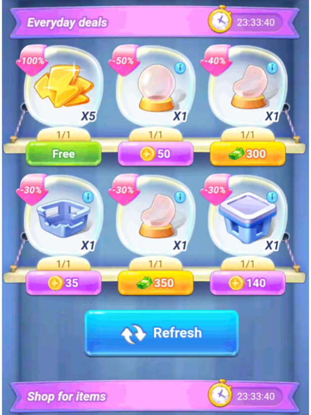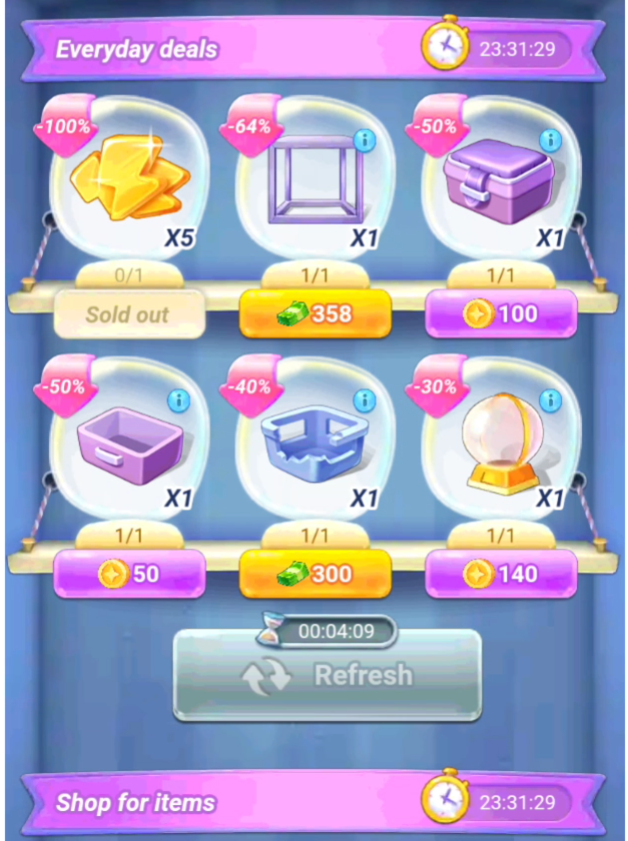 最初の Refresh は通貨を使用せずに可能で、通貨を使用すればEveryday deals と Shop for items でそれぞれ1日当たり3回+4回 Refresh可能です。