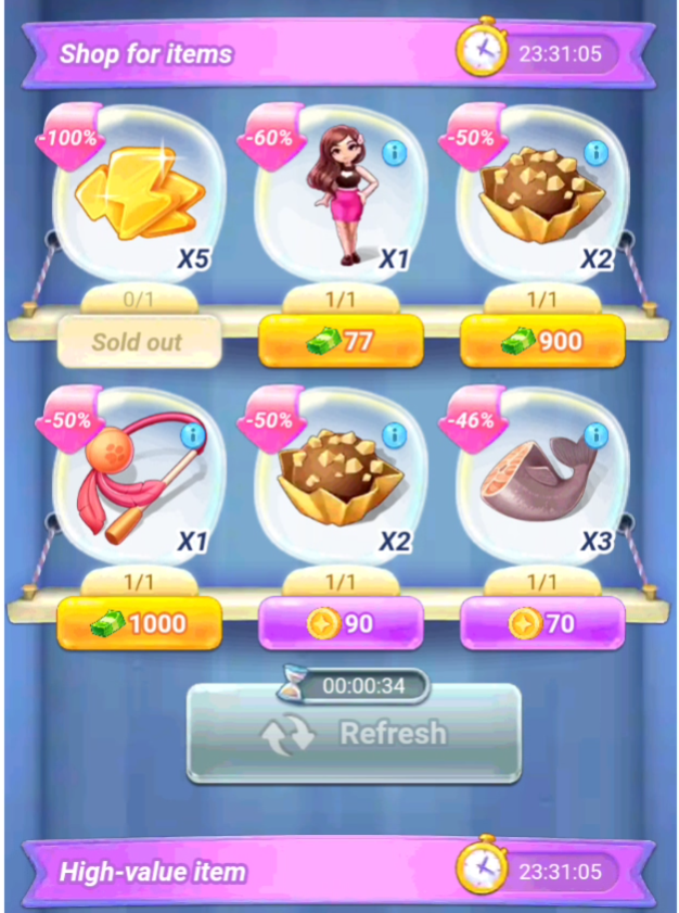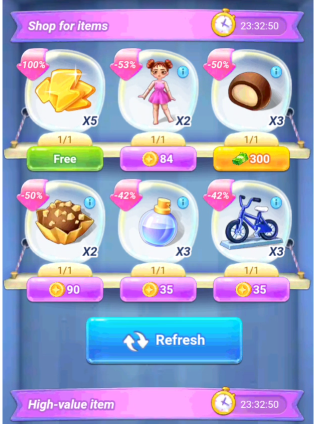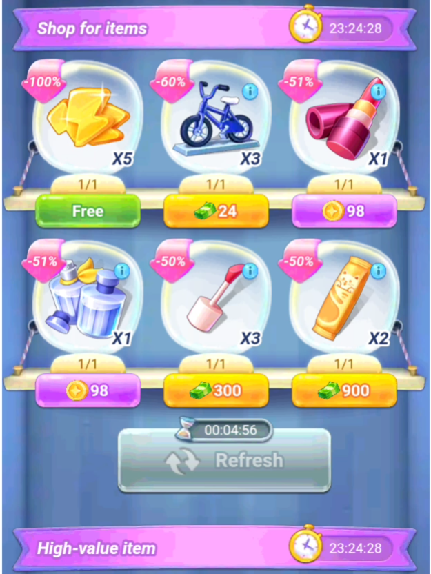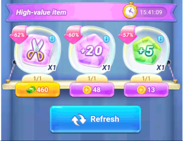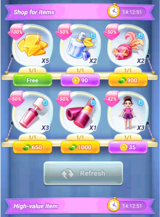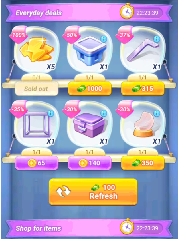 最初の Refresh は通貨を使用せずに可能で、通貨を使用すればEveryday deals と Shop for items でそれぞれ1日当たり3回+4回 Refresh可能です。
