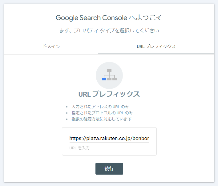 サイト全体ではなく特定の記事に関しての調査・設定なので、「URLプレフィックス」を選んで、ブログ記事のURLを入力してみます。