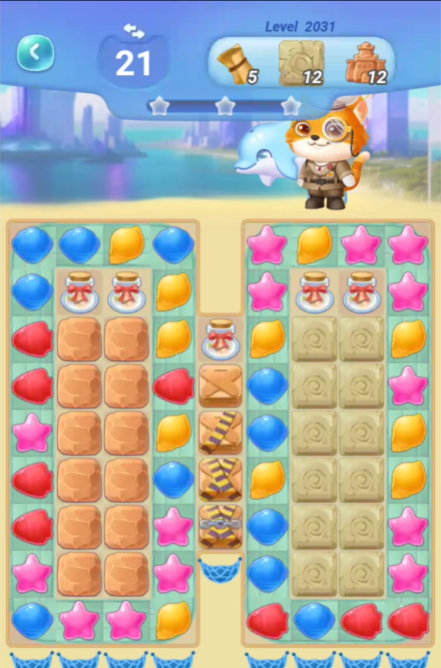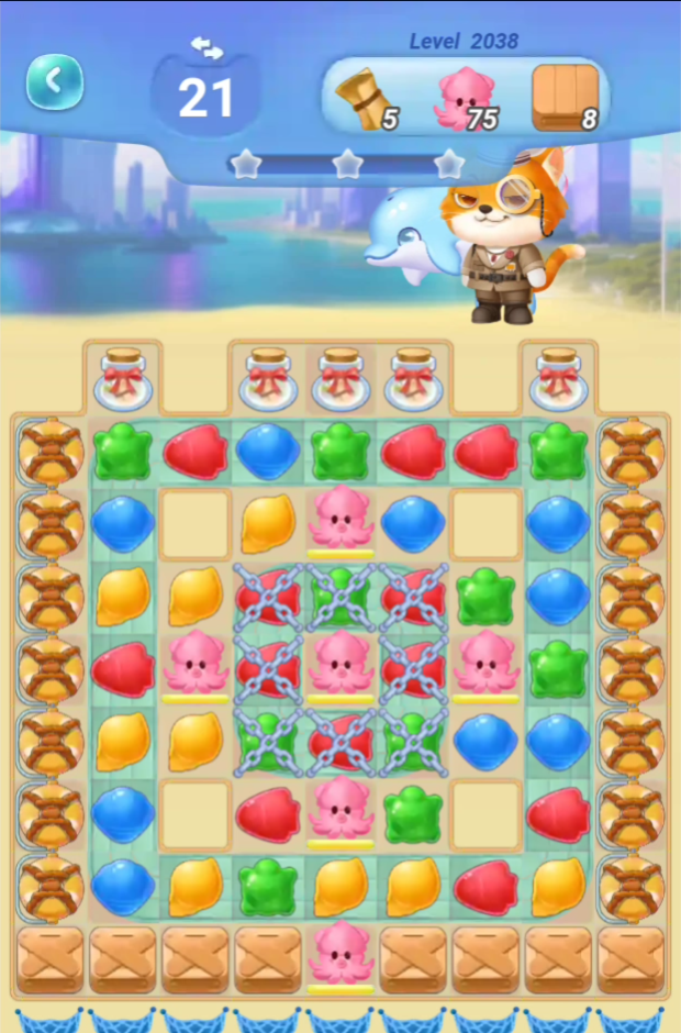 左右にひもエリアがあるので、ひもを連続してけずれそうなところを狙ってひもを切れば左右に隙間が発生します。タコが75個分消さないといけないので、21手でクリアするのはちょっと無理な感じです。