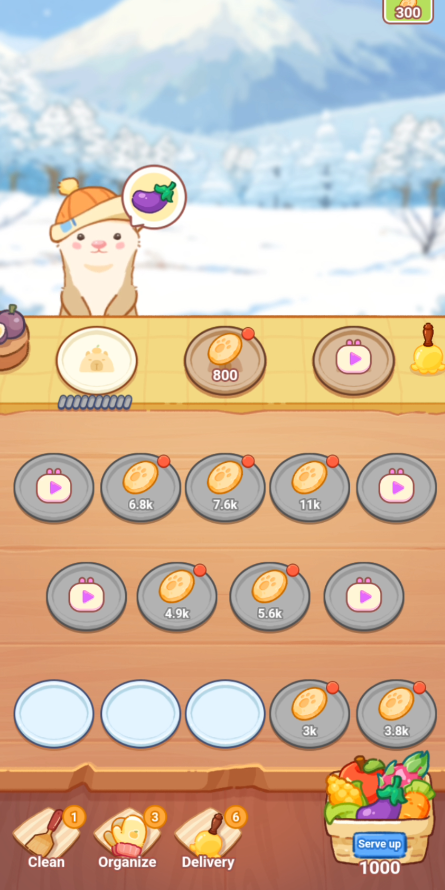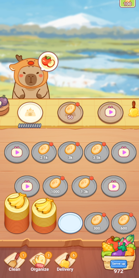 広告をみたりゲーム通貨をためて使えるお皿の数を増やしていきながら、最上段で Capyが欲しがっている野菜・果物をあげないといけません。