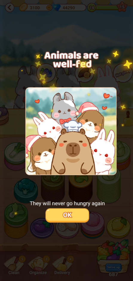 15枚程度以上皿を重ねると、(場合によってはしばらくしてから)満足して、別のCapyが現れて新しいリクエストにかわります