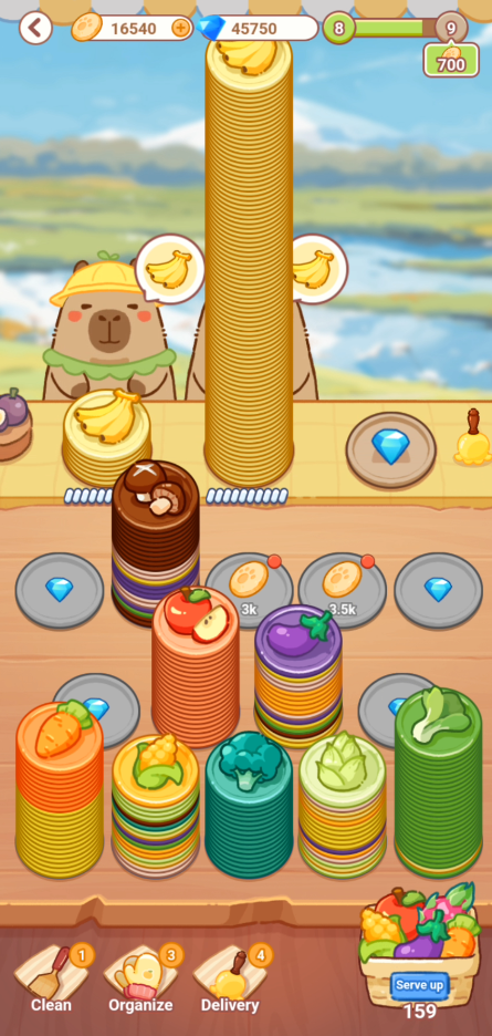 お皿のあいだで野菜・果物を移動させ、Capyが欲しがっている野菜・果物を最上段のCapyのお皿に必要な数以上、のせてあげるゲームのようです。