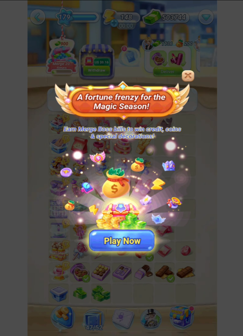 12/1になって Daily Missionの報酬がもらえなくなっていた AliExpressアプリのMerge Boss(マージボス)ですが、今日(12/4) 17:00の更新後に確認したら、新しいメッセージが表示されました。