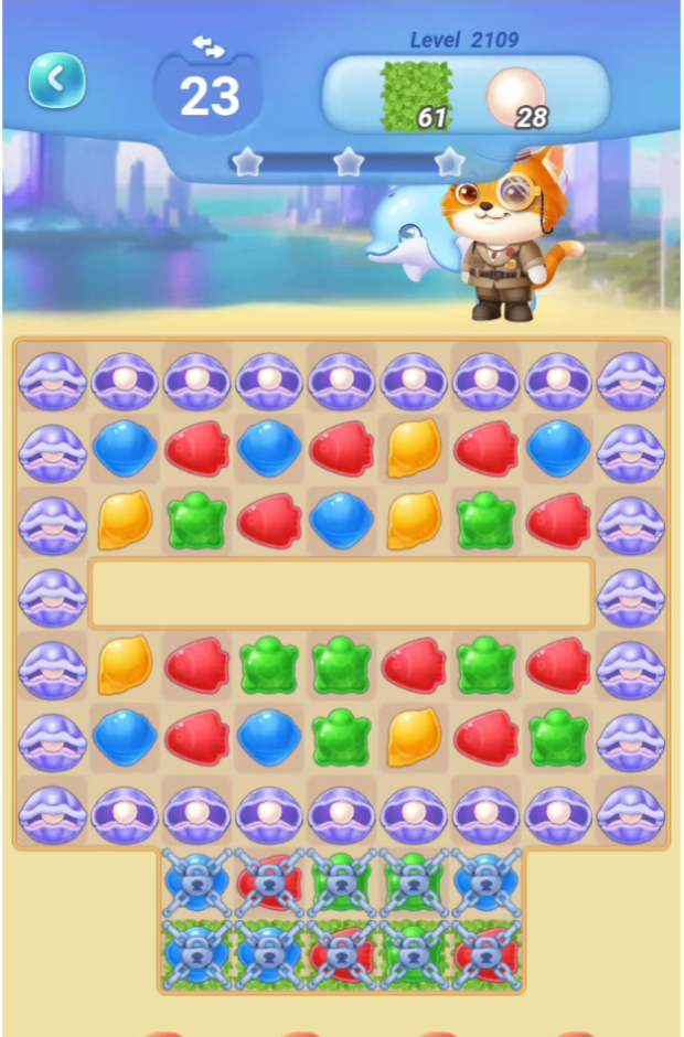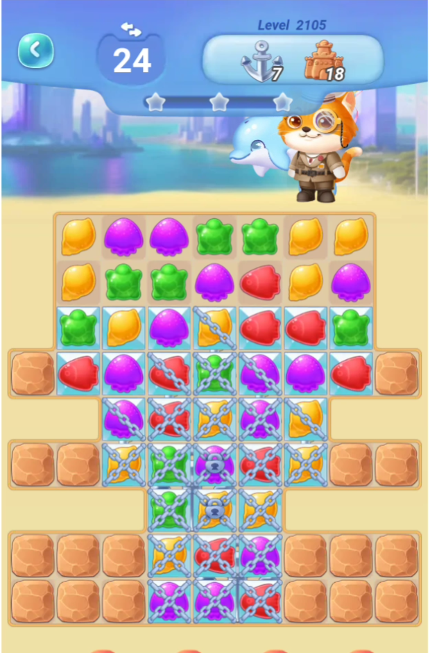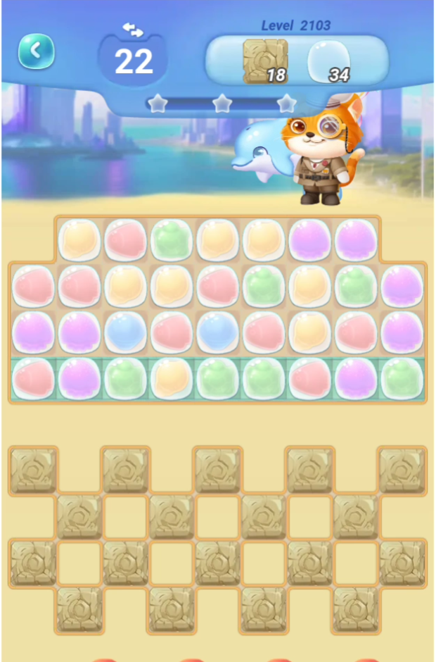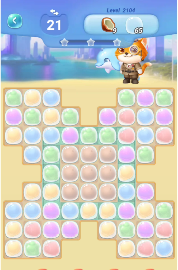 いままで見たことのあるようなアイテムで、何が新しい消し方・アイテムなのかよくわかっていませんが、果物のようなものは隣接した場所の物を消すと1段階ずつわれていき、白い雲のようなものは中に包まれたものを消すと、徐々に白さが薄れていきます。それぞれ移動可能なので、できるだけ多くものを消したり、または爆弾などのアイテムを生成できるように考えながら消していきます。移動する道がジグザグ上に斜め移動していくのは初めて見た気がします。