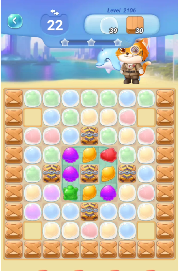 4隅にすきまが空いていて消しにくい領域が残ります。ある程度木の箱に穴を開けた状態で、虹+ミサイルが作れないと消せない場所が残ってしまいます。最初に虹がが作れるのですが、これは毎回なのだろうか?