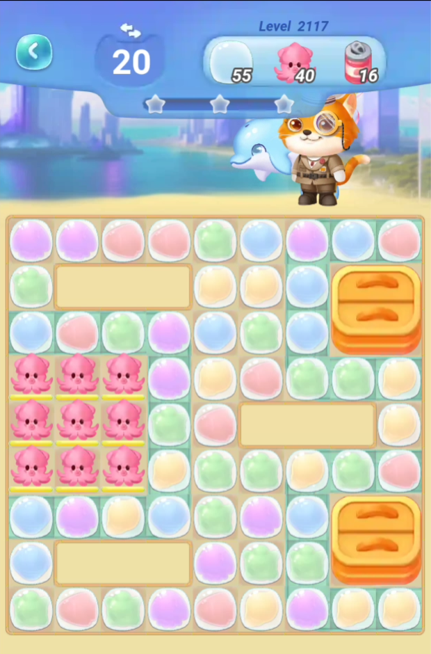 白い雲(?)55個、タコ40回、缶16個の合計111個を20回で消すという Continue回数制限が気になる面です