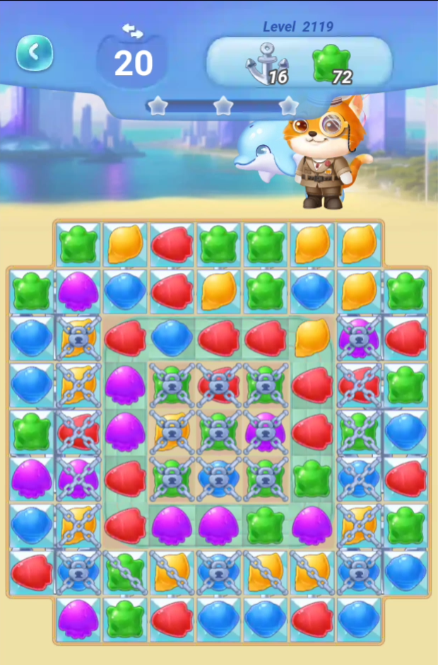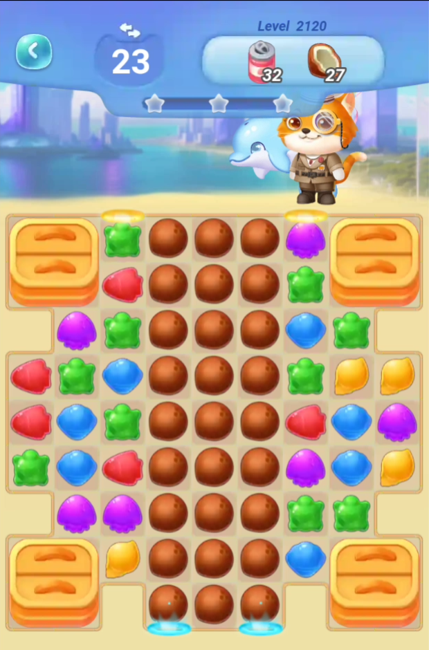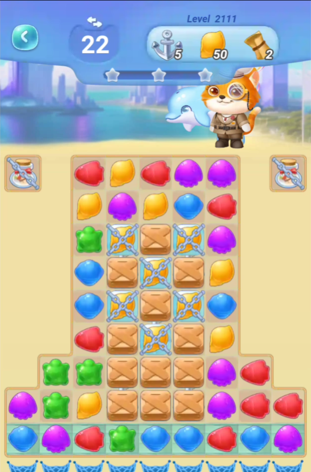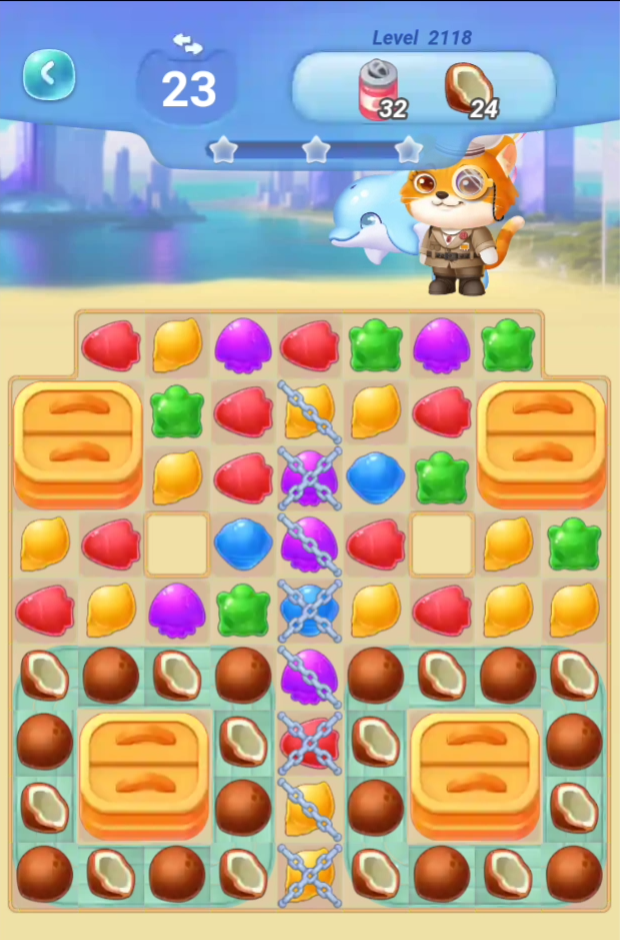 縦・横ミサイルは当たる位置に作れないので、ロケット+虹ができるといいのですが、中央部の木・鎖エリアをきれいにしないと、アイテムが作れません。