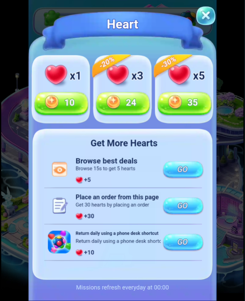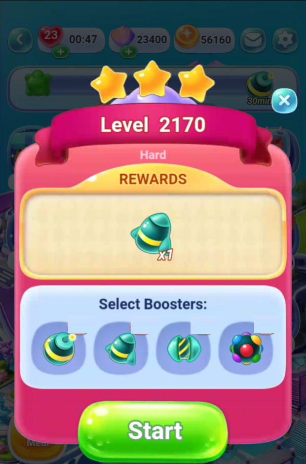 ちなみに、ルールがかわったようで、一度クリアしたLevelをクリアしても Heartがもらえなくなりました。Heartは通常時間がたつと最大30個たまっていて、1ゲーム当たり5ずつ消費するので、広告等をみないと連続して6ゲームに挑戦するとHeartが足りなくなります。