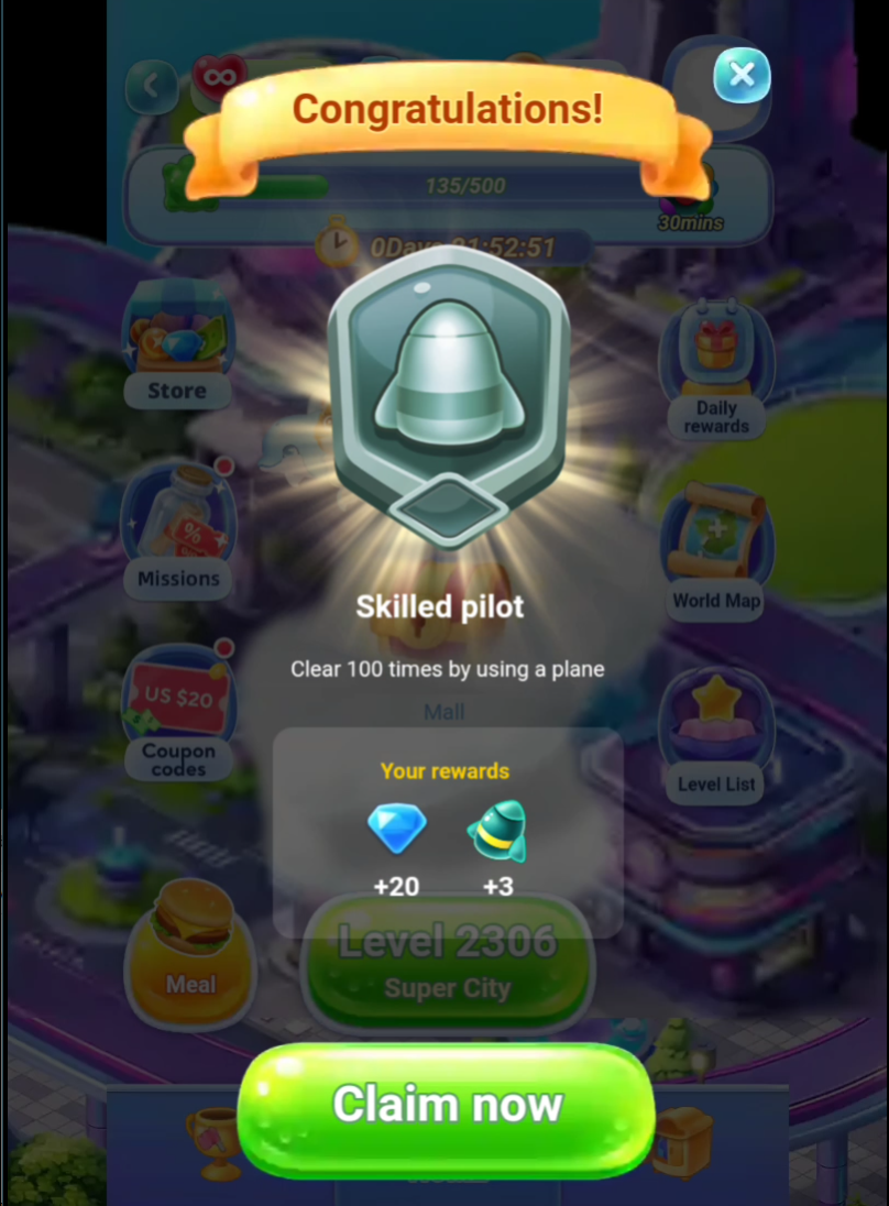 「plane」を 100回使ったので、宝石 20個と、飛行機アイテムを3個もらえたみたいです。