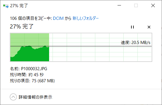 いつも新しいフォルダができた後にフォルダ単位でPC/NASにデータをコピーするのですが、1つのフォルダ分だと 10MB×1000枚で 10GBにもなるので、フォルダのコピー時間は次のような時間かかります