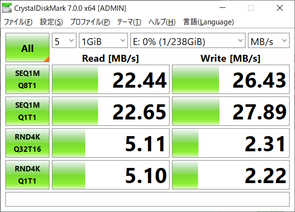 この2つの組み合わせで CrystalDiskMarkでベンチマークをとるとこんな感じのデータになりました。