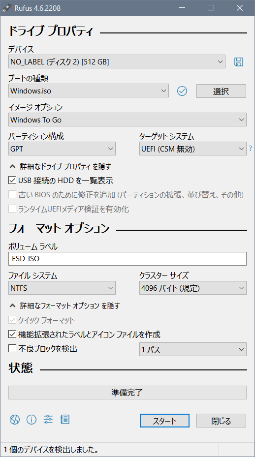 Rufusを起動しても USB SSDやHDDはデバイスには表示されません