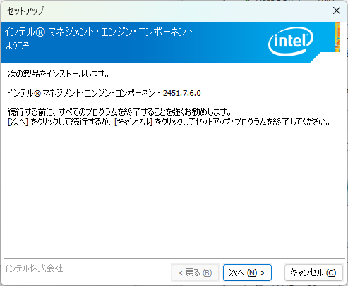 インテルマネジメント・エンジン・コンポーネントドライバーのインストールです