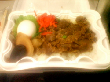ふたを開けて、湯気を立てる牛肉に温泉たまごをぽとんと落とし、だしを回しかけ、唐辛子を振り、軽くまぜまぜしてごはんと一緒にいただきます♪