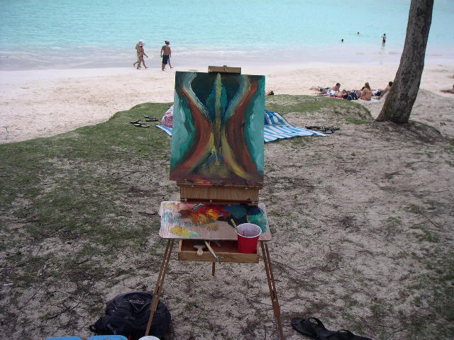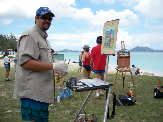 もう、ほんとにこれで最後の写真ですね。ハワイの。まあ、好きな写真はまた、取り上げて行きますが。最後は、この方、私達が見た絵で一番、上手かったです!全然カイルアでないんですが・・・。実は、この方すぐ向こうで同じく写生している女性を、描いていたんですね。もしかして、彼女にホの字なんでしょうか?(夏盛りホの字組?違ったか?)奥に見える、女性。隣の帽子の男性は、はぶかれているだけにあやしい!!でも、彼女は、描かれているの知っていたのかなぁ?いやぁ~、上手いです!!すばらしい!!でも、こんな手袋履いてしてるんですね。俺なんか、毎回絵の具だらけで同じ油なんで、最初サラダ油で洗うといいんだけどね。 俺も、やっぱ次回はほんと、アクリル絵の具とスケッチブック持参でハワイ行くかなぁ~?ラナイから、ダイアモンドヘッドなんて描いたら最高だろうけどそんないいホテルは泊まれないのでやっぱ、カピオラニ公園行って描くしかないかなぁ~。やるっきゃない!(いや、意味はないです。最近、スカパーでスチュワーデス物語見ていて) そして、描いていた彼にYou、No1みたいな事、たしか言ったあと、撮ったのが最初の写真で母が撮ったものですね。 はぁ~、これで載せてなかったハワイの写真も全て終了ですね。新たなものは来年の旅行記までお預けだけど時々、ハワイネタとして本、CD,DVDなど紹介しつつまだまだ、先ですがアロハ計画、昨日のハワイアン航空の話みたいな行きたいところやりたいこと書いて行きますので!たまに、ハワイ以外でもいいんですがどーも書く気がしなくて・・・。 まあ、次回は、半年前、一軒家(モチ貸家)に引っ越して、自分の部屋アトリエ兼ハワイアンルームを紹介しますんでお楽しみにぃ~! おお、久々に5日で4回も更新しちゃったわのさ。