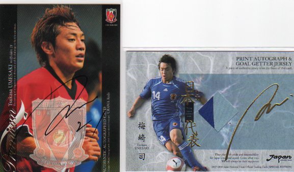 今日はトリニータの新体制が発表となりました。残っていた鈴木慎吾と山崎哲也の契約更改も発表され、今シーズンのメンバーも確定したようです。昨シーズンの戦力はほぼ維持できましたし、後は若手(ルーキーの住田・東も含む)の成長に期待したいところです。そして、今シーズンの背番号も発表されました。昨年から在籍する選手は変更はなく、新加入の選手は、坪内が2、住田が18、東が21、レンタルからの復帰組は、宮沢が32、梅田が34となりました。てっきり、梅田と宮沢が15と17を付けるものと思っていましたのでちょっと意外でしたが、それ以外は大体予想どうりだったのではないでしょうか。原強化部長の話では、アジア枠として韓国人選手をリサーチしていくということでしたので、その選手が15or17を付けるのでしょうか?とりあえず、今年のレプユニに何番を付けるか考えたいと思います。さて、本日は最近入手したカードをご紹介します。今シーズンはルーキーの東慶悟が背負う21番をかつて付けていた選手のカード。そう、この選手です。 左:08TE高級版浦和 梅崎司サインカード右:07-08代表SE 梅崎司プリントサインジャージそう、司のカード2種です。浦和は監督も交代しチャンスだと思うので、今年は試合に出てほしいですね。そして東には、司を超える選手になってほしいものです。