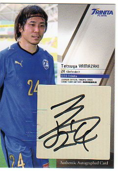 今日は、1月31日。そう、トリニータの始動日です。ということで、朝からトリニータの練習を観に行ってきました。昨シーズンは過去最高の成績を残し、しかも主力がほぼ残留したとあって、今日の練習初日はさぞかし多くのサポーターで溢れかえるんだろうと予想していたのですが。そんなに多くはなかったですね。この前の新ユニホーム発表会の方がよっぽど多かったです。でもまあ、理由もわかる気がします。なにしろ、今日は寒かった!気温はそんなに低くはなかったと思うんですが、とにかく風が強く体感温度がとても低く感じられました。そんな中でも、選手たちは元気な姿を見せてくれました。初日の練習は、ランニングと軽いボール回しだけでしたが、楽しそうな選手たちの様子を見てホッとしました。今シーズンの開幕が待ち遠しいですね。さて、本日、山崎哲也の現役引退&アシスタントコーチ就任が発表されました。昨日、契約更改が発表されたばかりだったので驚きましたが、確かに今日の練習でも選手のものではなくスタッフと同じウェアを着ていましたし、ボール回しにも参加せず球出しをしていました。山崎選手、現役生活本当にお疲れ様でした。これからもアシスタントコーチとしての活躍に期待しています。 08TE大分 山崎哲也サインカード