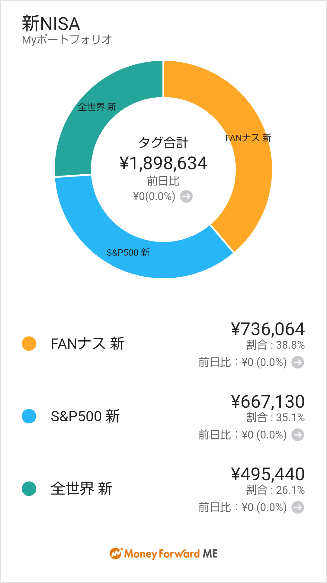 総資産の推移だけでなく、新NISAの推移も記録として残します。総資産の方は確定拠出年金とか旧つみたてNISA、仮想通貨などが混じっているので純粋に2024年1月から始めた新NISAのみの状況は以下のとおりです。内訳 S&P500 667,130円 全世界株式 495,440円 FANG+ 523,492円 NASDAQ100 212,572円総資産で見ると攻撃部分(FANG+とNASDAQ100)の比率が低いので、新NISAでは重点的に投資していきます。