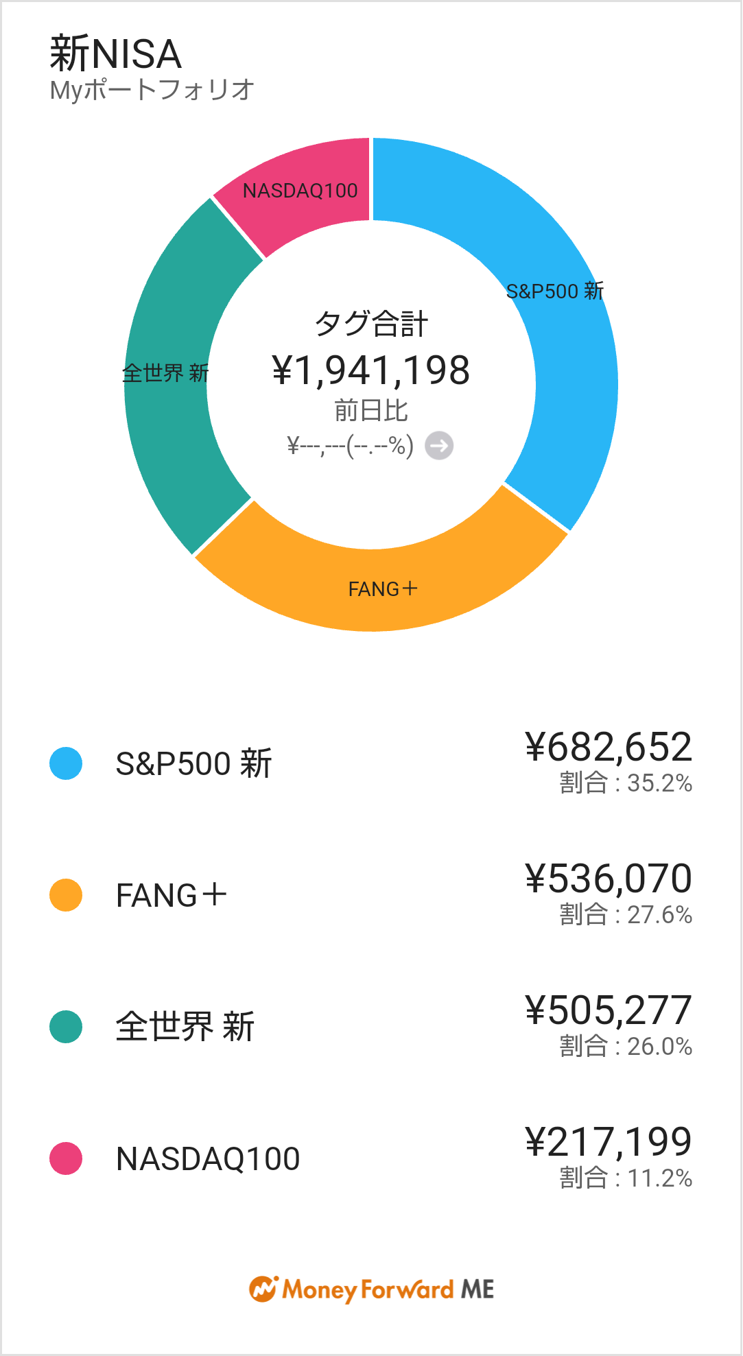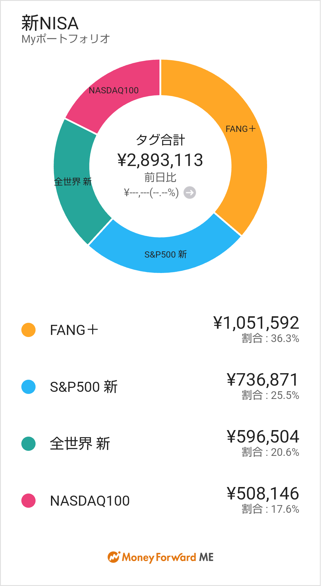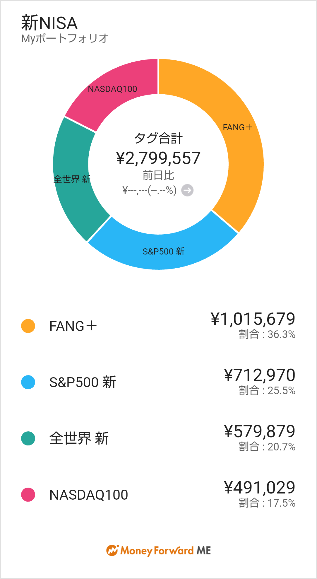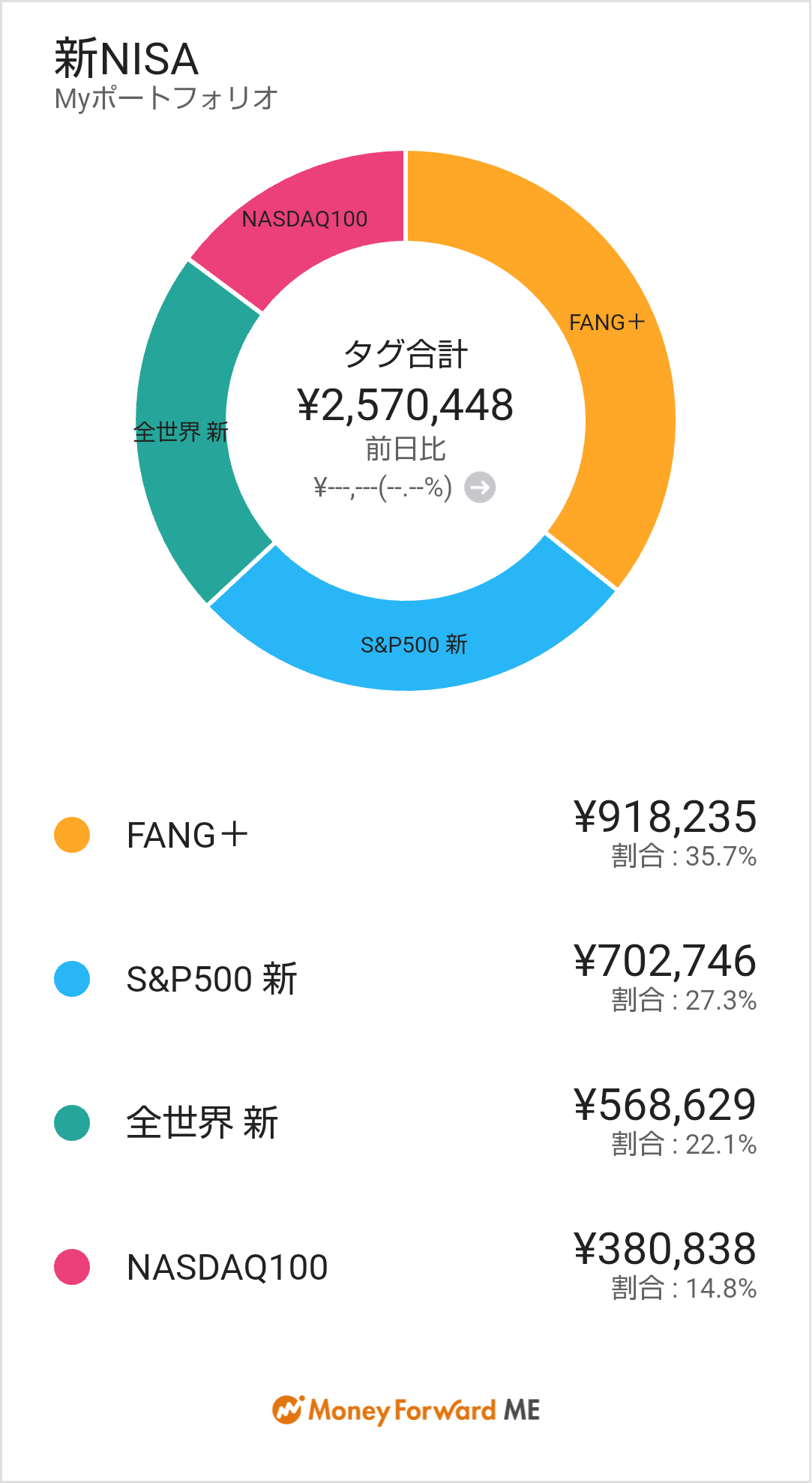 今週の新NISA推移はこちら↓9月13日 9月20日 【投資信託】 資産額:2,570,448円(評価損益:+297,245円、損益率:13.1%) 評価損益:+49,741円(前週比) FANG+ 918,235円(+25,220円) S&P500 702,746円(+8,438円) 全世界株式 568,629円(+6,994円) NASDAQ100 380,838円(+9,089円)先週は+3万円だったのに、今週も+5万。良い感じ。FANG+とNASDAQ100の比率はもう少し上げたいところ。積立日の月初に下がってくれるとありがたいんだけどなぁ~