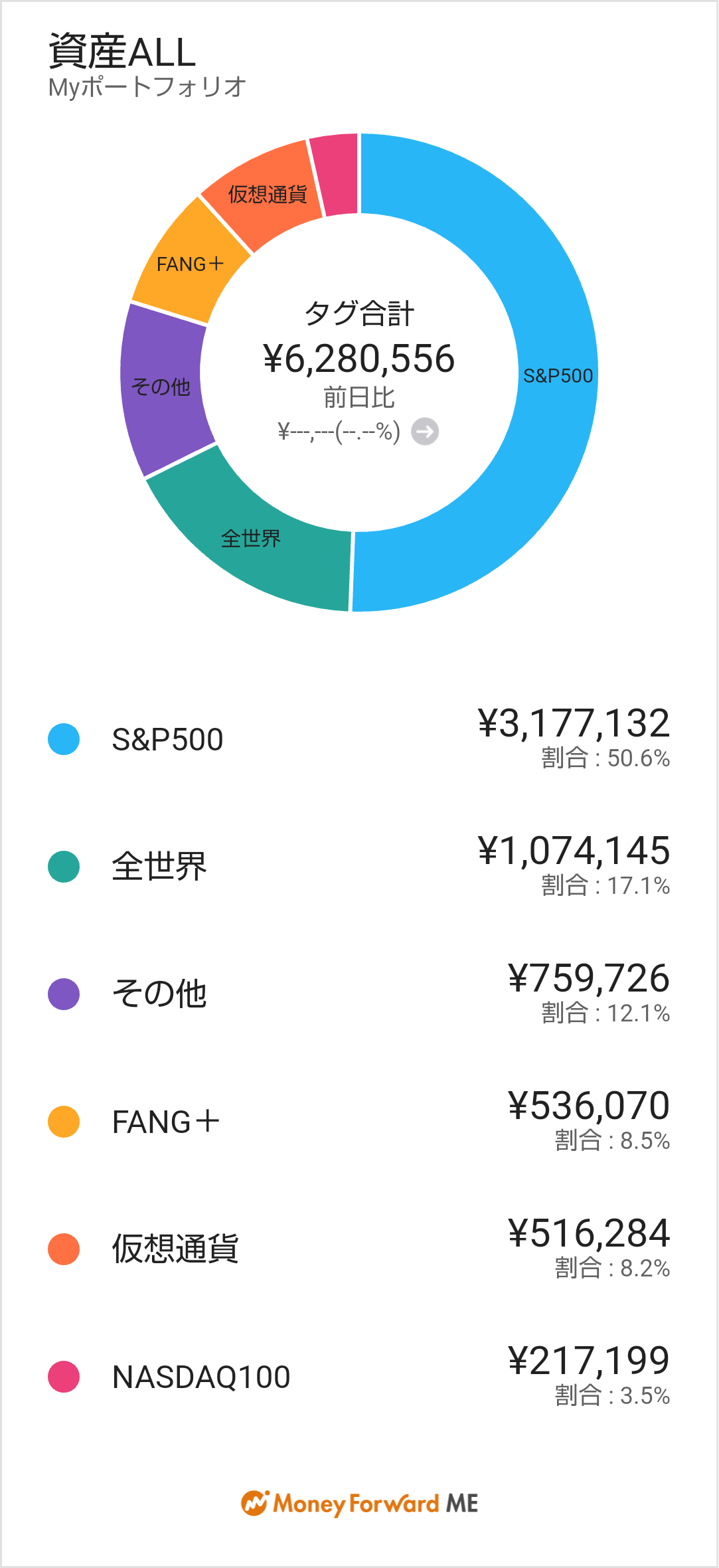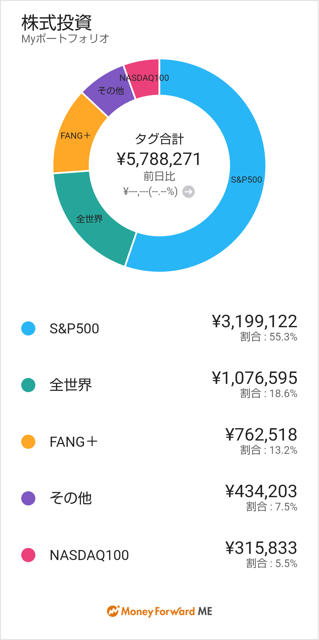 今週はNVIDIAの決算とか色々あったようで…仮想通貨は週間の推移が激しすぎて逆に分かりにくいので、投資信託のみを記録します。資産推移はこちら↓ 【投資信託】 資産額:5,788,271円(評価損益:+1,589,975円、損益率:37.9%) 入金額:19,638円、評価損益:+57,791円(前週比) S&P500 3,199,122円(+50,379円) 全世界株式 1,076,595円(+5,928円) FANG+ 762,518円(+21,247円) NASDAQ100 315,833円(+4,100円) その他 434,203円(▲4,225円)今週は確定拠出年金の入金もありつつ、全体的にアメリカ株は好調。その他(新興国、日経)がマイナスでした。まぁ金曜日深夜のアメリカ株が全体的に1%以上マイナスだったりするので上がったり下がったりですね。自分は資産形成期なので、株価が下がってくれる方がありがたいんですが。