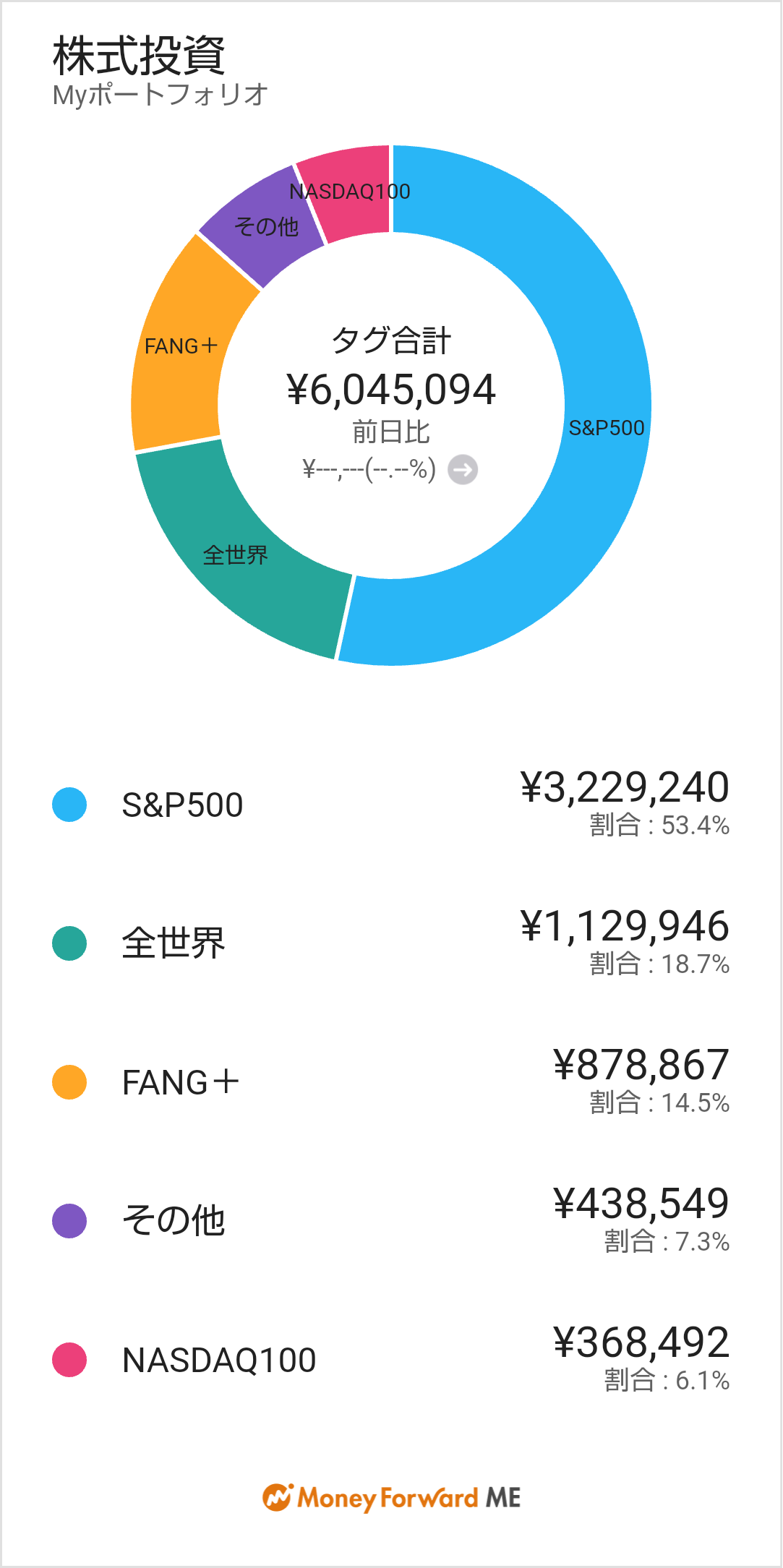 今週の資産推移はこちら↓8月30日 9月6日 【投資信託】 資産額:6,045,094円(評価損益:+1,646,798円、損益率:37.4%) 入金額:200,000円、評価損益:+56,823円(前週比) S&P500 3,229,240円(+30,118円) 全世界株式 1,129,946円(+53,351円) FANG+ 878,867円(+116,349円) NASDAQ100 368,492円(+52,659円) その他 438,549円(+4,346円)今週は月初の積立20万円がありました。今月は全世界:5万、FANG:10万、NASDAQ:5万で投入。アメリカ株も上がっていたので資産は先週比で5万6千円プラスでした。週明けは下がりそうですが、来週も JUST KEEP BUYING!