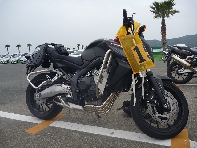 湖畔でHMS上級を受講してきました。レンタルバイクは650Fの新車(まだ400km弱の走行距離)でした。マットブラックの新車受講者は16名くらい?イントラさんは、N村さんとW田さん。まずは慣熟走行の時点で違いがわかる。以前からある650Fがいかにヤレているか。体重移動だけでハンドルが切れる。スクールの内容は、今日は結構ハード。朝一番から、5mオフセット。寒いかと思ってウインドストッパーのジャケットを着ていたら、暑い。最初の休憩でオフジャージに替えました。たくさんの受講者が参加しています午前中はそのままコテコテ系の練習で終わり、午後一番はコーススラ。後輪加重を意識しつつ右手でのアクセル操作のし易さを狙うのだが、結局前傾してしまう。常にお尻に体重がかかっているままで走行することを意識するが、まだまだだ。最後に更にコテコテオフセット系。トータル63kmほど走りました。久しぶりに脚が疲れました。次のHMSは29日だが、その前に16日にKRiSPフルコースを申し込んでいます。無理しないようしよう。バイク壊したくないし。