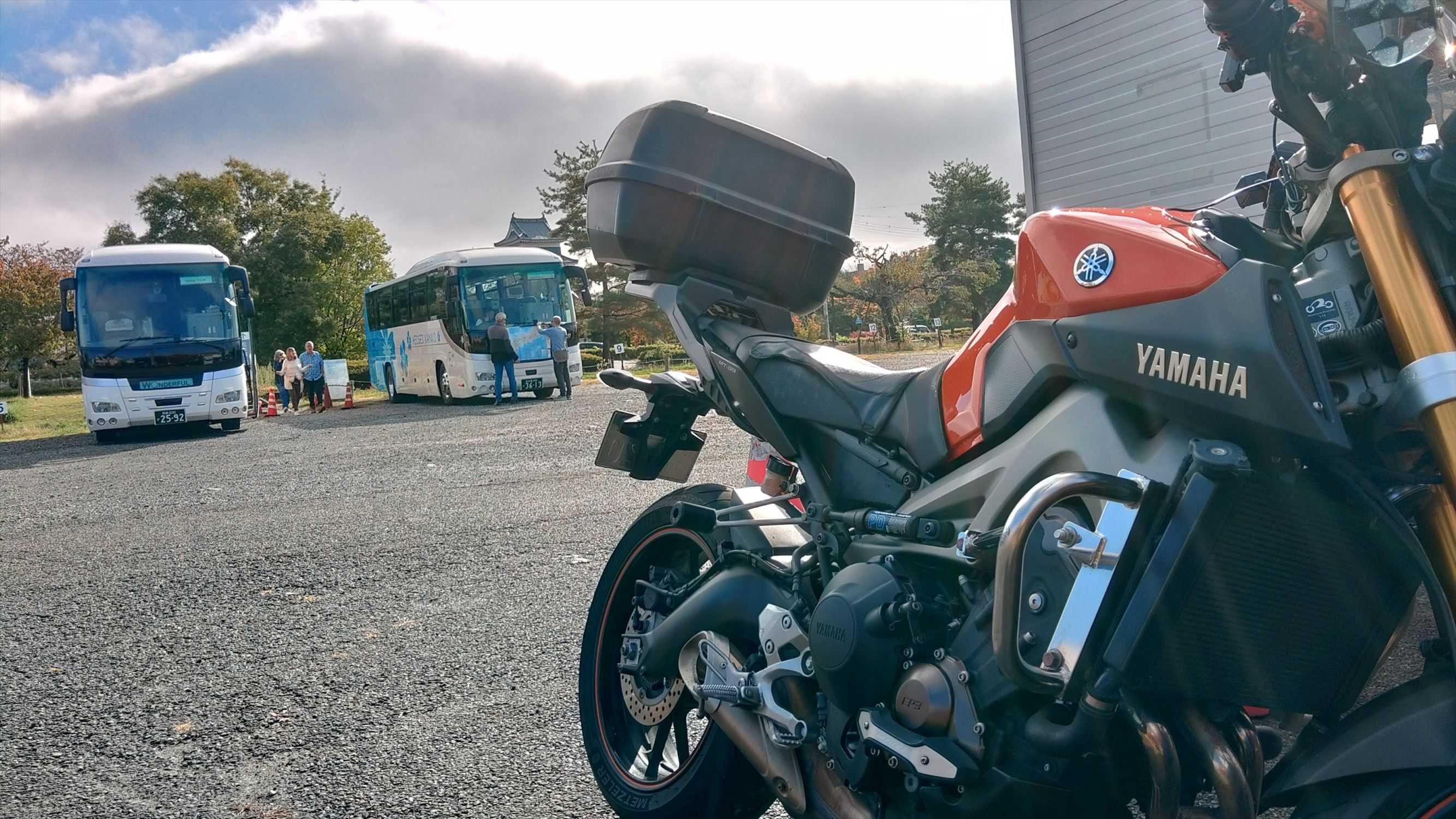 お城までは3km、20分ほどですぐ横にある大型バス専用駐車場に二輪も駐車可能(終日100円)なので、そこに止めてお城に入りました。