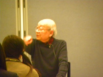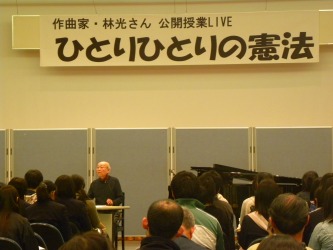 公開授業は、高校生約50名が受講。それを見守る参観者が100名ほど。 「こどもと本」・「みらい」・「とだな」など光さんの自作の曲を演奏し、解説をしながらゆっくり進んだ。 高校生との対話はなかった。光さんのマイペース。 <心に残ったひと言> 意識の「ずれ」を大事にすること。 夫婦茶碗の大きさの違いとVIVARDIをビバルディではない表記に「こだわる」ことを例にあげながら、憲法と国民の意識の「ずれ」=ゆれ(ちょっとまってよ)を読み取って生かすことの必要性を説明。 更に、山田かずおの詞・曲で、童謡「かくれんぼ」の♪・・・もういいかい♪(詞は違う)の音階で終わっている小品があるという。なぜ彼は♪もういいよ♪に当たるものをつけなかったのか、と問いかけた。(小生の知らない作曲家) 正に、憲法の生きた読み解き方を音楽の形で、我々に投げかけたのだ。 「きまり」だから「まもれ」ではないのだ。 国民“ひとりひとり”の立場に立って運用される「きまり=憲法」であるべきものなのだ。 “林 光”といえば、何といってもオペラ「森は生きている」や映画「はだかの島」のテーマ曲など数多くの曲を作り、音楽教育の指導者としても大きな影響を与えてきた人。 まだ現役だ。 <隣席のつぶやきから> 光さんの影響を受けた音楽教師や地域の指導者は全国に多い。 中には、信奉者とも言えるような支持者(ファン)が生まれた。(と、小生は思っている) 受付けで訊くと、県内の限られた団体へのおしらせだったのに、東京や千葉など県外からの来場者が多いのに驚いていると言っていた。 その一団と思われる人たちの会話から。 「合唱団で一生懸命やっていた人たちが、どんどん止めていくのよね」 「そうなんだ。コンクールで優秀賞を取ったのに、あっさり止めていくんだ」 「ほんとの音楽の喜びを知らないのよ」 「コンクール音楽だけを目指していて、大切な“音楽”を伝えられなかったんだ」 つい、聞き入ってしまった。考えさせられる会話だった。 いまや何でも競争だ。勝てばちやほやされ、負ければ見向きもされなくなる。 即ち「ずれ」が受け入れられず、勝ち組と負け組みの二極化。これでは社会は崩れてしまうのだ。 79才の巨匠に会いたくて行ったので、これでよし