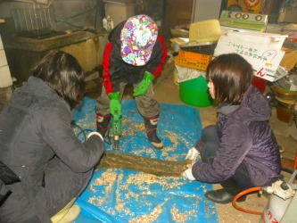 新5年生6人と保護者6人来村。 午前中の予定は釣り堀での釣り。 釣り堀に着いたら、ポツリ ポツリの雨が大粒となり、風が吹き荒れだす。 止む様子がないので、予定変更。 「ぼちぼち村」にもどって、午後予定のシイタケの植菌作業をやる。 ほだ木に穴を開けることから子どもたちにやらせる。 けがをさせないように「疲れたら交代」。 お母さんたちにもやってもらう。 こうして二回り、見回りするころにはすっかり任せられる状態に。 穴の開いたほだ木は、菌を詰める係りへ。 こうして1時間ちょっとで35本完了。 全員、共同作業のすばらしさにバンザイ! 午後、雨は止んだが脳風(訂正:暴風)は続き、気温は下がってきた。 その中で子どもたちは投げ出さずにそれぞれの家族分22匹を釣った。 ここでも大事なことを学んだようだ。 休憩所で弘牧場から差し入れてもらった牛乳を沸かしてもらって飲んだ。 体が温まったところで解散となった。 みなさんの協力のお蔭で無事に終わってよかった。