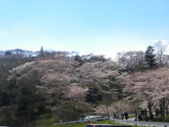 昼から天気回復。「タカ」と二人で「船岡城址公園」に花見に出かけた。 その公園は、かつてNHKの大河ドラマ「樅の木は残った」で知られた所。 頂上に“平和観音像”が建っている。 直ぐそこに見えるのだけれど、どっちに回っても渋滞。 なので、公園近くに住む友だちのSさんちに車を置かせてもらい歩いて上った。 花のトンネルをくぐり、広場に上がる。 アマチュアミュージシャンの歌声が響いていた。 「タカ」の好きな曲らしく、終わるまで聞き入っていた。 「樅の木は・・・」の記念樹から白石川沿い(下流)のサクラを望む。 続きはあした・・・
