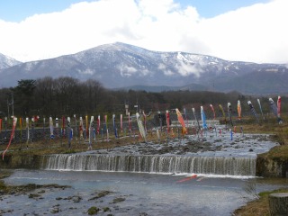 やっとポカポカ感を味わっている。 昨日は仙台での講演会に行くため、「ぼち村」から遠刈田温泉を経由した。 山麓を差知る県道は、みぞれあり、どしゃ降りあり、薄日がさすなど荒れていた。 これは、遠刈田(とおがった=アイヌ語で凸凹の多い所)温泉の澄川を泳ぐ鯉のぼり。 中腹にはスキー場があり、これからはスイセンの花見で賑わう。 この辺は標高が高いので、さくらの開花はこれから。