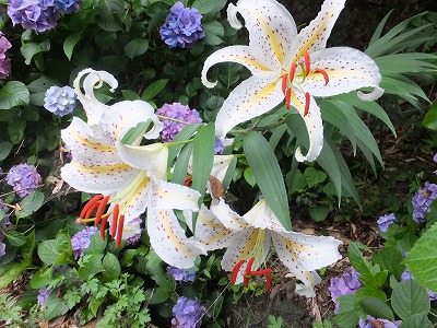 アジサイを追っかけてヤマユリも咲き出した。 こちらはヌルデの葉からアジサイの花。