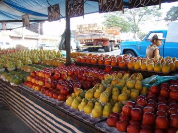 ブラジルでは、週末にいろいろな場所でフェイラという、青空市場が開かれています。最初の頃にプリマに連れて行ってもらったフェイラ。 きれ~いにフルーツやら、野菜やらが並べられています。カラフルでかわいい♪手のひらよりも大きなアヴァカチ(アボカド)は、確か2つで1.5レアル。マンガ(マンゴー)は3つで4レアル。私が両替した時のレートで計算すると、それぞれ約90円、約240円というところでしょうか。フルーツ、野菜は日本より安いですね~♪ そして、さとうきびジュース☆おじさんがさとうきびを機械に入れて、絞ってジュースを作っています。かなり美味しい♪(旦那さんは好きではないようですが^^;) 一番小さなコップで1レアル(60円)くらい。市場で見かけたら必ず飲むほど気に入っています♪