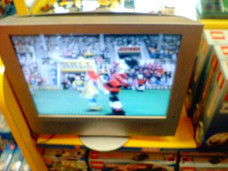 で、銀座の博品館では何が流れていたかというと、全てレゴで作ったクレイアニメーション(ちょっとずつ動かしては写真を撮ってぱらぱらマンガみたいにするやつね)のサッカーの試合が流されていました。 At Hakuhinkan, we can see cay-animation of Lego(a soccer game).