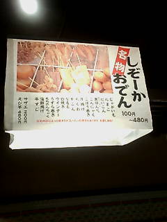 静岡温泉旅行2泊3日に行ってきた。静岡おでんを食べる。おでんにふりかけをかける・・・なんか変な感じ。だいこんを食べる・・・味がしみ込んでいてうまい!しらやきを食べる・・・あんまり美味しくない。牛スジを食べる・・・角煮みたいでとても美味しい。黒はんぺんを食べる・・・舌触りがざらざらする。卵を食べる・・・味がしみ込んでいてうまい!ジャガイモを食べる・・・肉じゃがみたいだ。静岡おでん、おいしかった。しかし、このお店でメニューを見たとき、おでんはおやつなのかなと思い、B定食も頼んでいたので、お腹は満腹状態。また、おでんのジャガイモとB定食のコロッケが口の中で共存したため口の中の水分が急激に失われた。どちらがうまい!?『静岡おでん缶』 VS 『秋葉原おでん缶』おでん食べ比べお試しセット次は焼津へ。