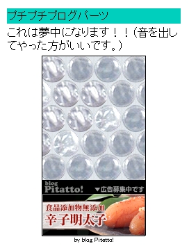 楽天ブログはJavaScriptをはれないので、残念ながらブログパーツが使えないのですが、やってみると意味なく、つぶし続けてしまいます。ほかにもブログパーツをはったページを用意してみました。ブログパーツリンクプチプチブログパーツhttp://blog-pitatto.com/parts/game03.html