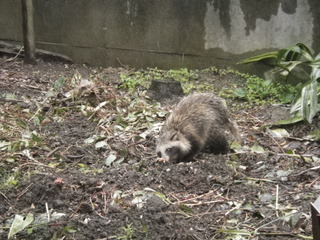 母屋の庭にお客さん。タヌキが来た。かわいく思えたが、これから畑の作物を荒らすかと思うと、ちょっと迷惑かも。
