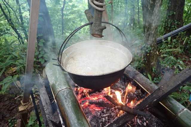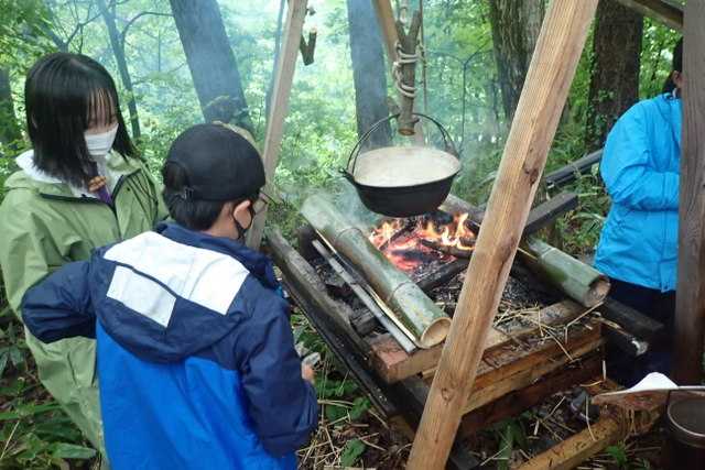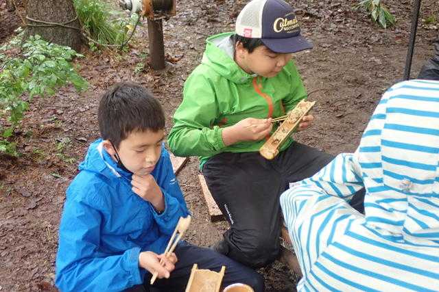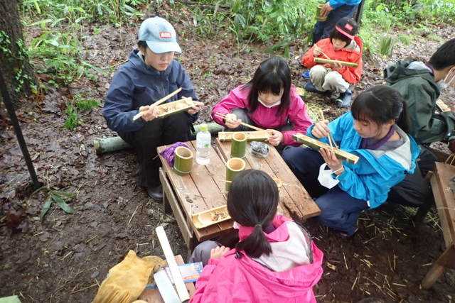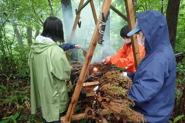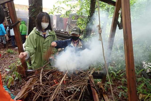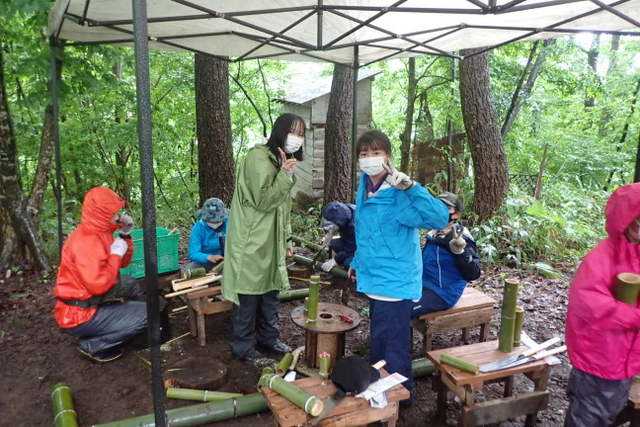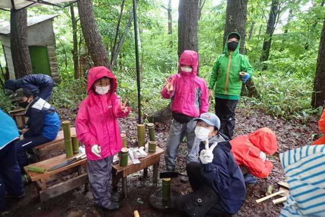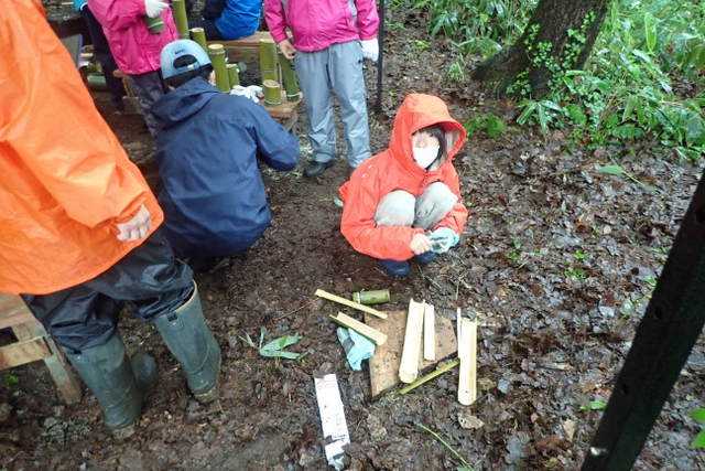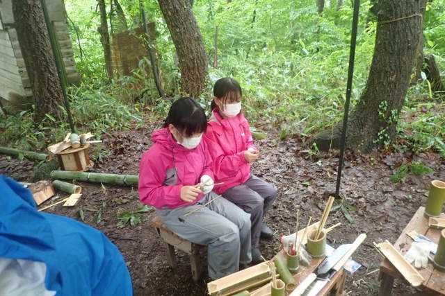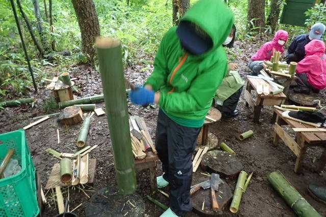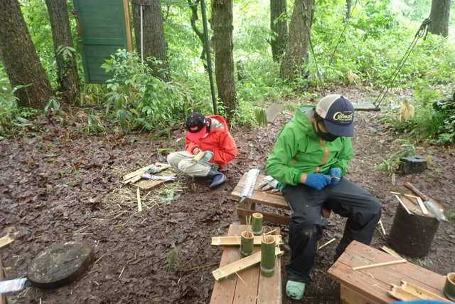 そんなこんなで雨も上がり、自由時間で、たき火をしたり、竹細工を作り込んだり、ジップラインで遊んだりと、山を満喫して今日は終了。