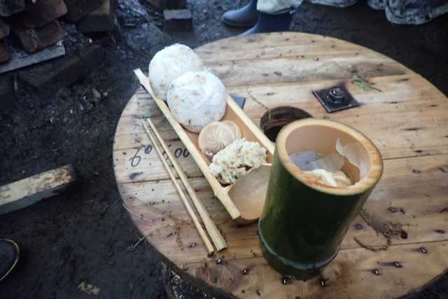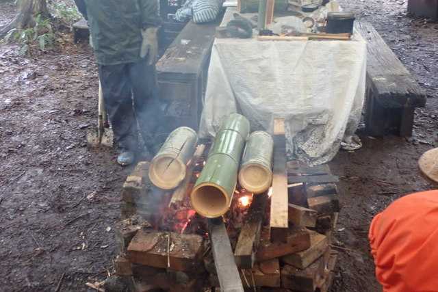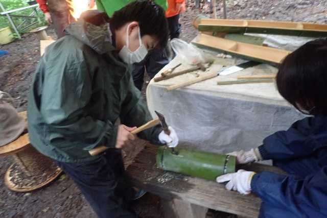 見えにくいのですが、竹ご飯を作るために、フタの部分を割っています。