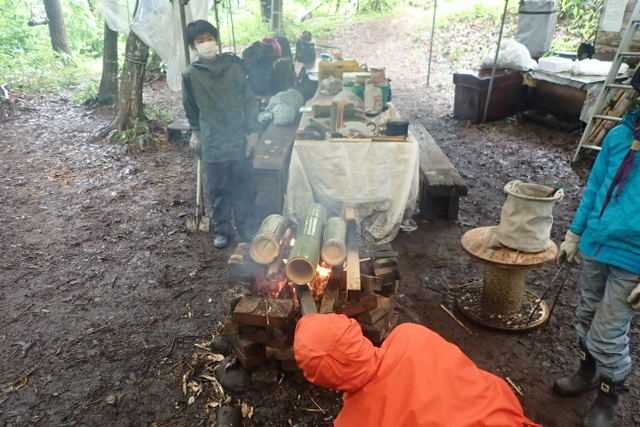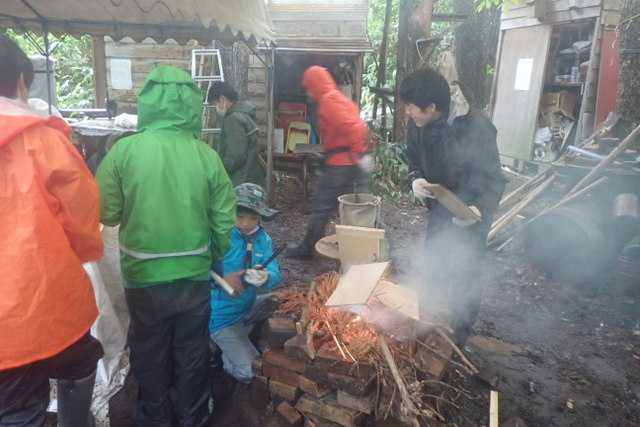 雨が上がってきたので、こちらのタチカマドでも火起こしを始めました。